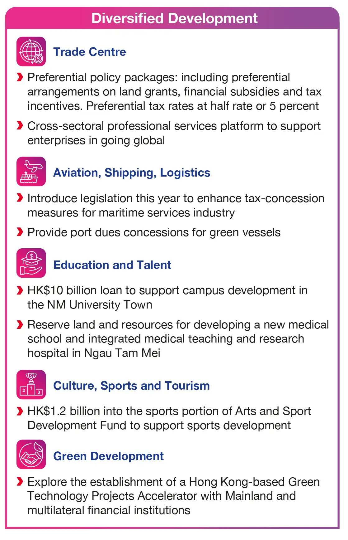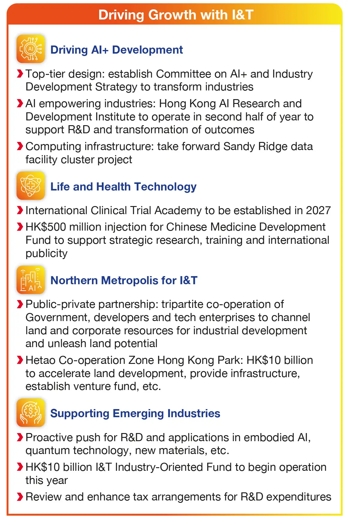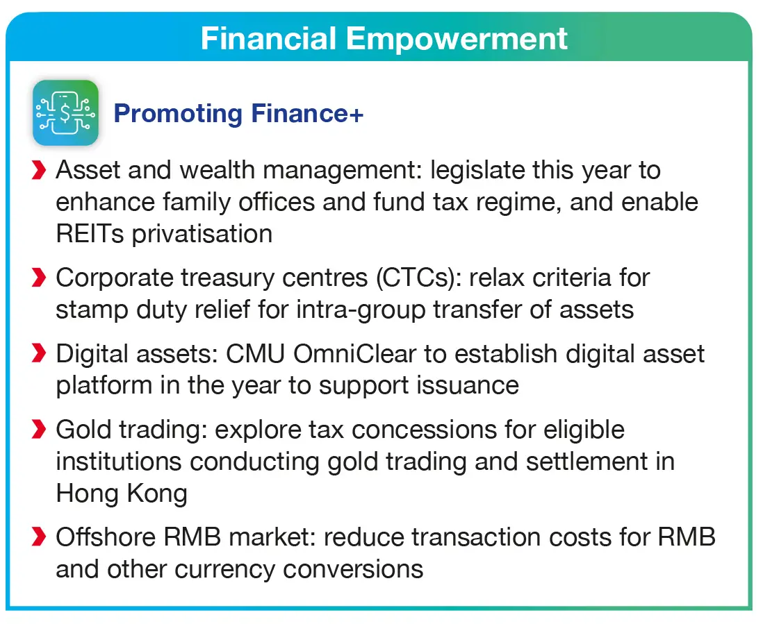 The Budget fuels the city’s growth through robust support for AI innovation and finance, alongside nurturing emerging industries, while proactively aligning with the National 15th Five-Year Plan to drive high-quality development. Measures also aim to unlock opportunities in the Hetao Shenzhen-Hong Kong Science and Technology Innovation Co-operation Zone and Northern Metropolis (NM), as well as strengthen support for people and enterprises to build a more caring, inclusive, and liveable city.