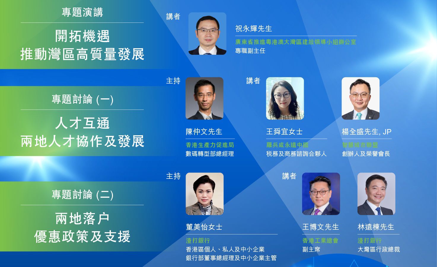 粵港澳大灣區(大灣區)在國家發展中扮演著重要的戰略角色,憑藉其強大的經濟實力、金融服務、經濟互補性和豐富的人才資源,無疑會展示高品質發展的巨大潛力。有鑒於此,本年論壇主題為《創新聚能 共攜灣區中小企互利共贏》,將聚焦討論人才發展以及在大灣區落戶的優惠政策,助力中小企了解大灣區的市場和商機,探索合作機會,實現互利共贏。