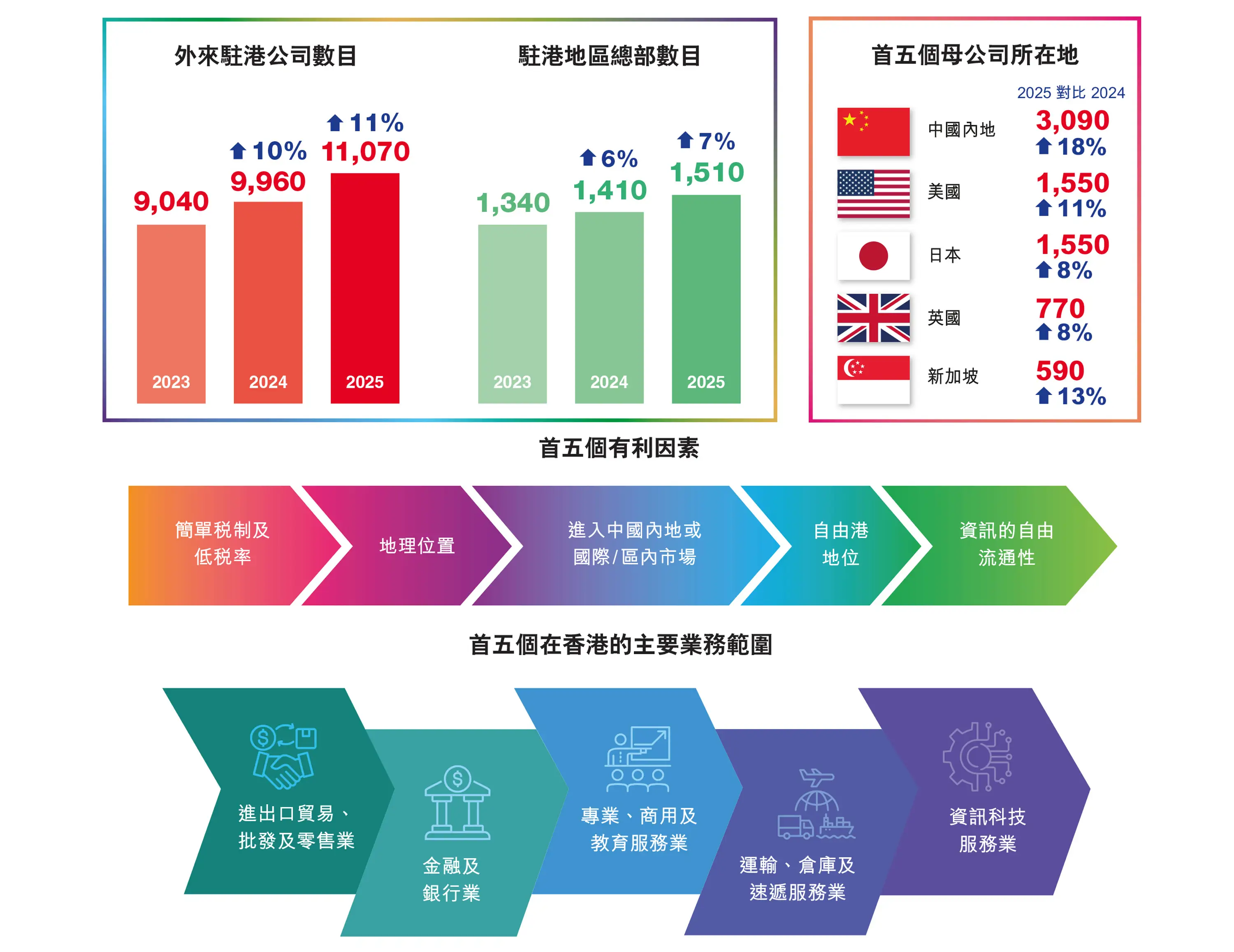 按母公司所在地分析,在2025年,內地駐港公司數目最多。為更好支援中國內地企業「出海」,由商務及經濟發展局局長統籌的出海專班於2025年10月6日正式成立,投資推廣署負責協調及支援出海專班的工作,為內地企業提供全方位免費「出海」服務,包括資金對接、夥伴配對、人才及市場拓展等。
